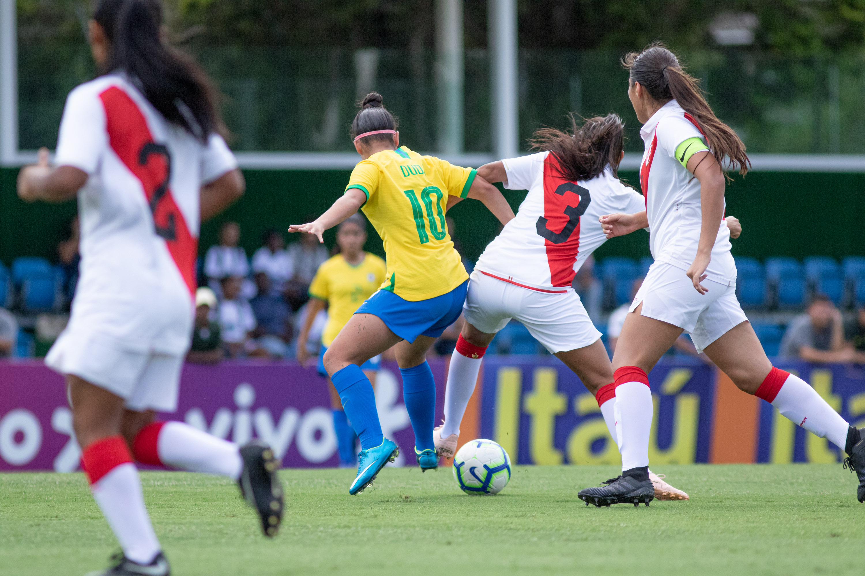 La cuadro verdeamarela se adelantó rápido en el marcador tras un cabezazo de Kaylane. El segundo llegaría a los 11', tras un penal convertido por Gica. A los 17', tras un mal rechace por parte de una jugadora peruana, Duda marcaría el tercero con un potente disparo que no pudo contener Silvana Alfaro, arquera peruana. Asi terminaria el primer tiempo con un marcador de 3-0 en contra.
